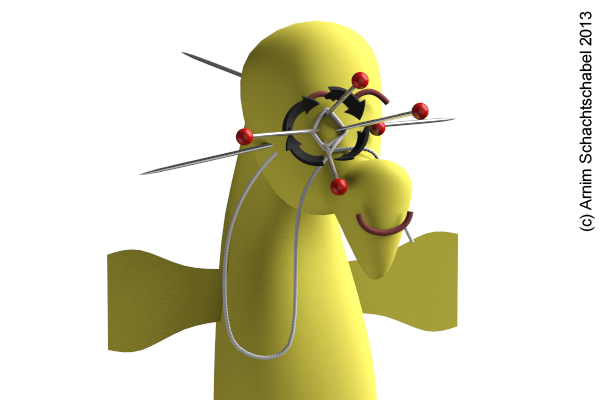 Ihr solltet parallel das zweite Auge mit den Stecknadeln ausstatten. Denn dann könnt Ihr am besten gewährleisten, dass sie auf der selben Höhe liegen. Später, wenn das Auge fertig ist, wäre es sehr schwierig, die richtige Position der Nadeln zu finden.